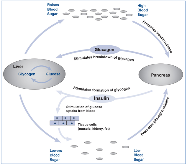 Figure 1 illustrates how glucagon prevents blood glucose from dropping to dangerous levels by stimulating the conversion of glycogen to glucose in the liver in a process called glycogenolysis. In addition, glucagon inhibits glucose consumption by the liver so that more glucose is able to enter the bloodstream.