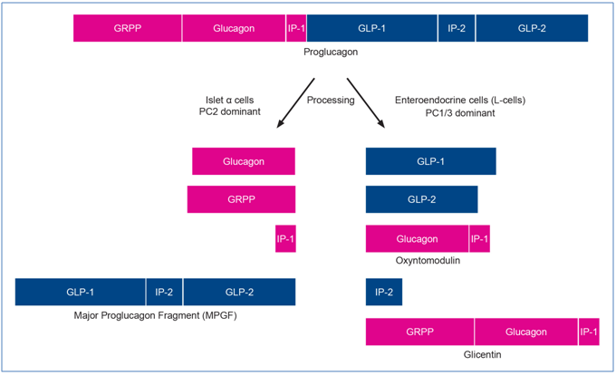 Glucagon is a 29 amino acid peptide structurally related to the secretin family of peptide hormones. Its sequence, synthesized as proglucagon, is highly conserved across mammalian species and is proteolytically processed into glucagon by prohormone convertase 2 (PC2) within the α cells of the pancreatic islets. Proglucagon is also expressed in the intestinal tract. In the intestinal enteroendocrine cells (L-cells), prohormone convertase 1/3 (PC1/3) is greater than PC2 action so the proglucagon sequence is cleaved to yield GLP-1, GLP-2, oxyntomodulin, glicentin and IP2 (Figure 2). There is evidence that PC1/3 is also expressed in the α cells of the pancreatic islets but at lower levels than PC2 suggesting that there is some pancreatic islet production of GLP-12.