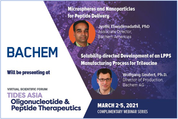 Principal speaker will be Dr. Wolfgang Seufert, who is Director of Production at Bachem’s Bubendorf facility, who delivered a similar presentation as part of Bachem’s presence at the virtual TIDES Asia 2021 conference earlier in March. At Bachem, Dr. Seufert leads a team focusing on the scale-up development of manufacturing processes for peptides in solution. Since joining Bachem more than 13 years ago and working in several positions at Bubendorf and at Torrance in the USA, he has gained broad experience in development, scale up, and manufacturing of peptides, using both liquid and solid phase peptide synthesis (SPPS). Wolfgang Seufert studied chemistry in Germany at the universities of Giessen and Leipzig. After earning his Ph.D. from the University of Basel (Switzerland) for his work on cyclization reactions of modified amino acids and peptides, he worked as a post-doctoral fellow at the Life Sciences Institute of the University of Michigan (USA).