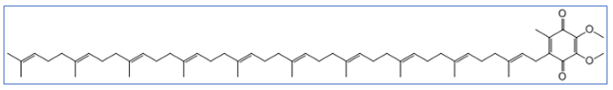 The chemical structure of CoQ10 includes 1,4-benzoquinone as a head group and an extraordinarily long polyisoprenoid lipid tail with 10 five carbon isoprene subunits, which makes it one of the most hydrophobic molecules in nature. Quinone head group makes it reduction–oxidation (redox) active. The redox activity of CoQ allows it to function as a cofactor for numerous enzymes, including those of the mitochondrial electron transport chain6. CoQ 10 exists in three redox states, fully oxidized (ubiquinon, CoQ), free-radical intermediate (semiquinone/ubisemiquinon, CoQH-) and reduced (ubiquinol, CoQH2.