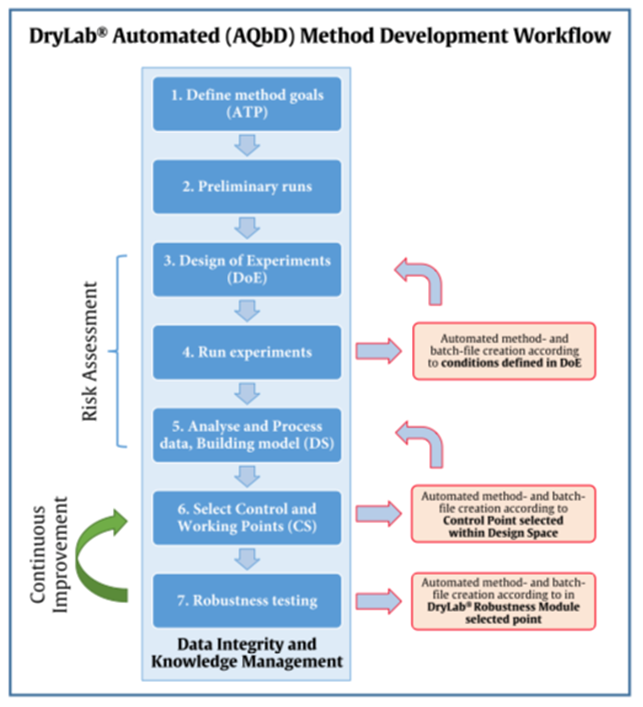 The QbD and AQbD concepts can be extended and allied to DryLab®4 automation to create systematic yet speedy method approaches that include defining methods goal, risk assessment, developing a Design Space, implementing a control strategy and continual improvement to increase method robustness and knowledge.