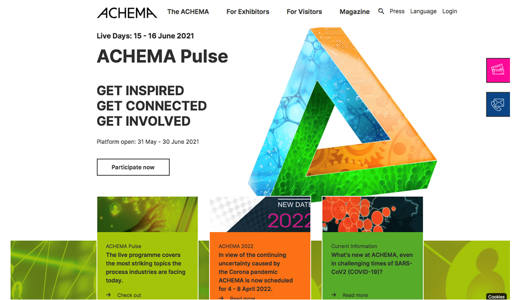 It will have a constant online presence at ACHEMA Pulse for networking and one to one online chats throughout the month of June (see Resources) and will make four contributions to the two Live Days, June 15 and June 16, where presentations and discussions are live streamed from three stages at a studio in Frankfurt-am-Main.