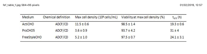 CHO-S growth kinetics in the three commercially available serum-free media tested. Abbreviations: Max: maximum; t1/2: duplication time; ADCF: animal-derived component free; CD: chemically defined; + number: standard deviation of the measured value.