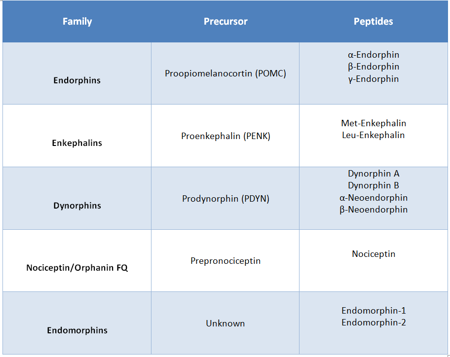 The endogenous opioid peptides exhibit different affinity and selectivity for the various opioid receptor subtypes (See Table 2).