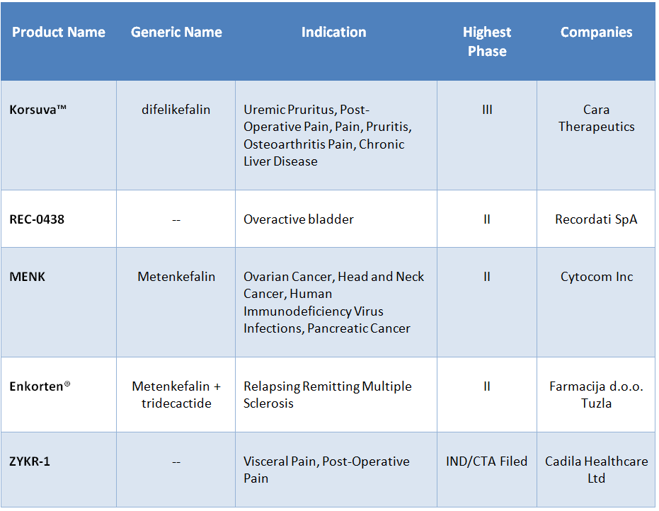 - Cara Therapeutics is developing Korsuva™, a κ-opioid receptor agonist, for the treatment of post-operative pain, uremic pruritus, chronic and acute pain, and chronic liver disease. In January 2019, Cara Therapeutics completed enrollment of the KALM-1 Phase III trial of Korsuva in hemodialysis patients with pruritus (18).