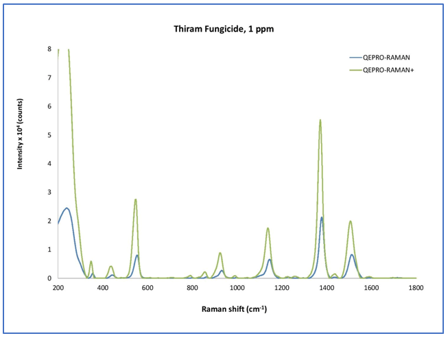 Resulting SERS spectra (Figure 1) clearly demonstrated that thiram at 1 ppm concentration was well within detection limits and that limits of detection would be significantly lower for QE Pro-Raman+ than for its predecessor.