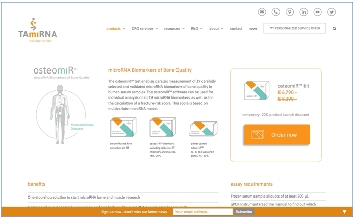 The website now provides more information and ordering functionality for TAmiRNA products, notably the thrombomiR® kit, which provides an in vivo measure of platelet function independent of the activation pathway or the osteomiR™ kit, enabling rapid detection of microRNAs that can serve as novel validated bone biomarkers for early diagnosis and prognosis of fracture risk in post-menopausal osteoporosis and bone quality.