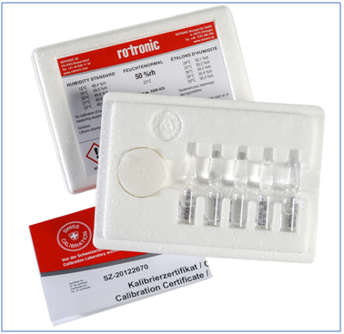 DIY calibration to Swiss Calibration Services (SCS) standards can be achieved by using the Rotronic salt solutions kit, consisting of packs of five hermetically sealed ampoules of the same humidity level. Each ampoule is labelled with the relative humidity (rH) value and a serial number. The values most commonly used are 35 % rH and 80 % rH, applied in two-point calibrations. For most standards, the ampoules contain an unsaturated saline solution. For the 0 % standard, Rotronic uses highly porous ceramic material (a molecular sieve).
