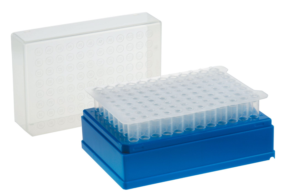 The alphanumeric marked racks are offered in a 96 tube (8 × 12) SBS footprint format and stackable lids and with 0.6 ml and 1.2 ml tube capacity compatible with most popular robotic systems as well as for individual sample storage. A special bottom plate allows easy handling of each sample, even in frozen conditions down to -85°C. The tubes are available as individual tubes or strips of 8 tubes of 1.2 ml. V-bottom to reduce the dead volume.