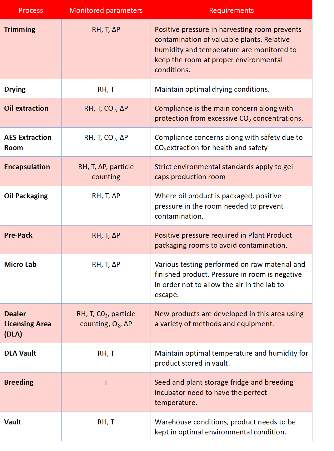 The process started by mapping customer requirements, which were complex, since cannabis production and processing is a surprisingly intricate process, with at least key stages that require environmental monitoring, as tabulated below: