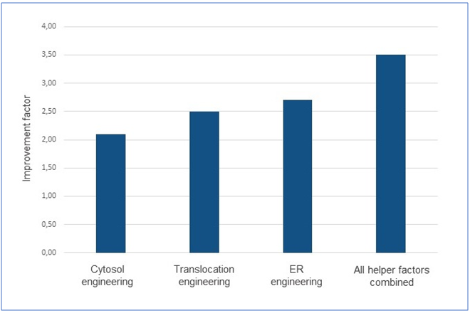 In an experimental case study, a set of helper factors acting either in the cytosol or the ER or facilitating translocation of nascent proteins into the ER were co-expressed in order to investigate a potential enhancement of VHH-dimer expression. Results from microscale as well as bioreactor scale showed a 2.0 – 2.7-fold improvement of product yield. Combining all three helper factors in one expression construct led to a 3.5-fold enhancement of product yield as depicted in the graph below.