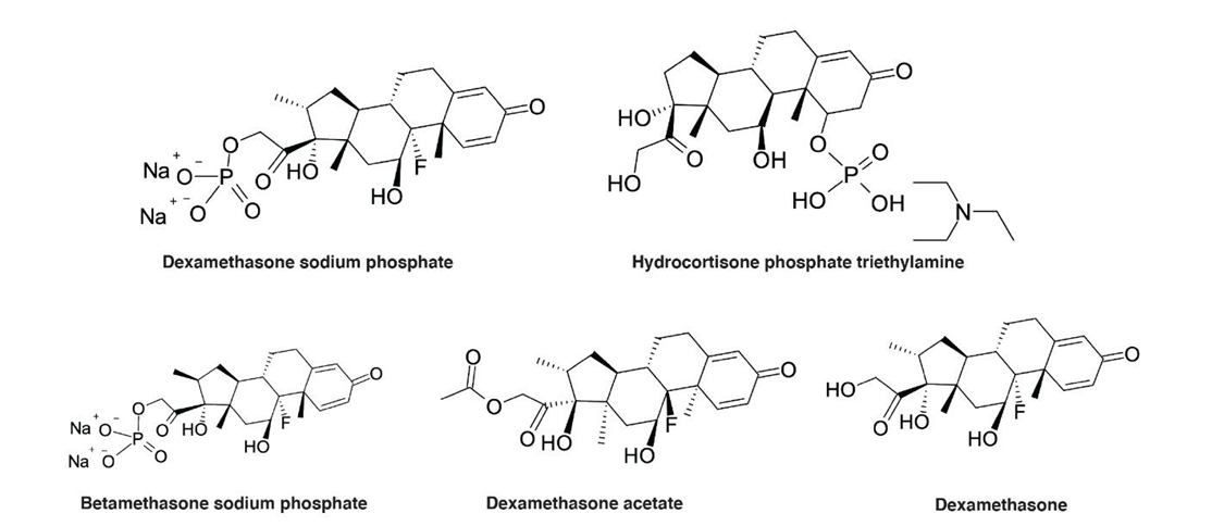 Alkhateeb and Rainville set out to develop a UHPLC application for analysis of metal-sensitive pharmaceuticals/related compounds using MaxPeak HPS systems and columns. They proved the method using two phosphorylated active pharmaceutical ingredients (hydrocortisone phosphate triethylamine and dexamethasone sodium phosphate) and three dexamethasone phosphate related compounds (Figure 1).