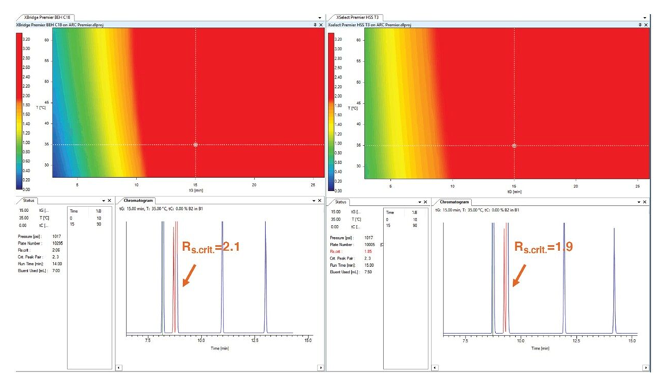 After data was processed and all peaks correctly tracked, the software automatically built models to create a resolution map for the combinations of conditions where desired resolution between peaks was achieved. Although the initial scouting conditions showed already acceptable separations, using the calculated model, the method performance in terms of critical resolution, run time and robustness could greatly be improved on both MaxPeak HPS Columns (the HSS T3 and the BEH C18). The two corresponding resolution maps were then compared for these columns on the Arc Premier System (Figure 3).