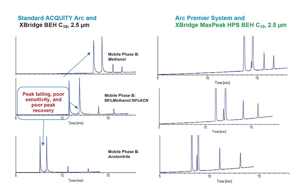 Results clearly indicated that the Arc Premier System in combination with the HPS MaxPeak Columns shows superior performance compared to the standard ACQUITY Arc System/stainless-steel columns (Figure 2), with initial scouting conditions showing extreme performance differences for peak shapes and areas with MaxPeak HPS versus stainless-steel.